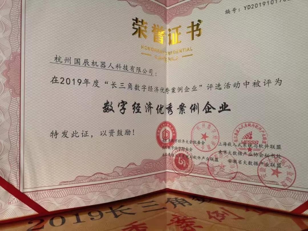 10月17日,“數字中國”長三角數字經濟之夜暨長三角數字經濟優秀案例企業頒獎典禮在杭州師范大學倉前校區--學術交流中心舉行,杭州國辰機器人科技有限公司榮獲“2019長三角數字經濟優秀企業”稱號。